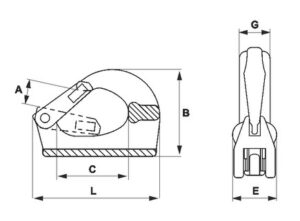 | típus | teherbírás (t) | A (mm) | B (mm) | C (mm) | E (mm) | G (mm) | L (mm) | saját tömeg (kg) |