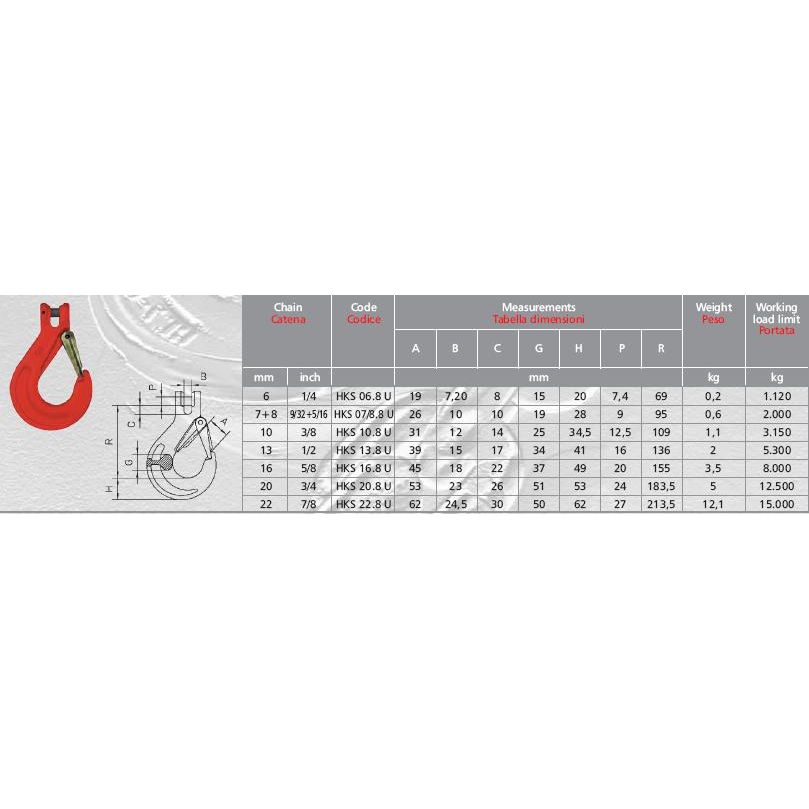 | Chain (mm) | Inch | Code | A (mm) | B (mm) | C (mm) | G (mm) | H (mm) | P (mm) | R (mm) | Weight (kg) | Working load limit (kg) |
